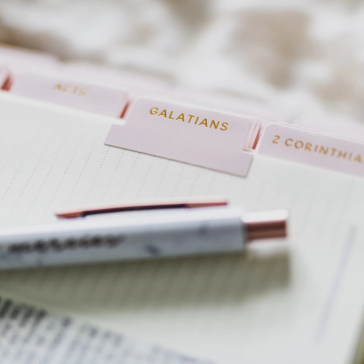 Flexible, matte coated sticker Bible tabs. Each set includes one double-sided tab for each book of the Bible as well as 23 additional sticker tabs.