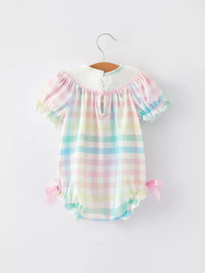 Easter Bunny Embroidery Girls Pink Plaid Bow Romper