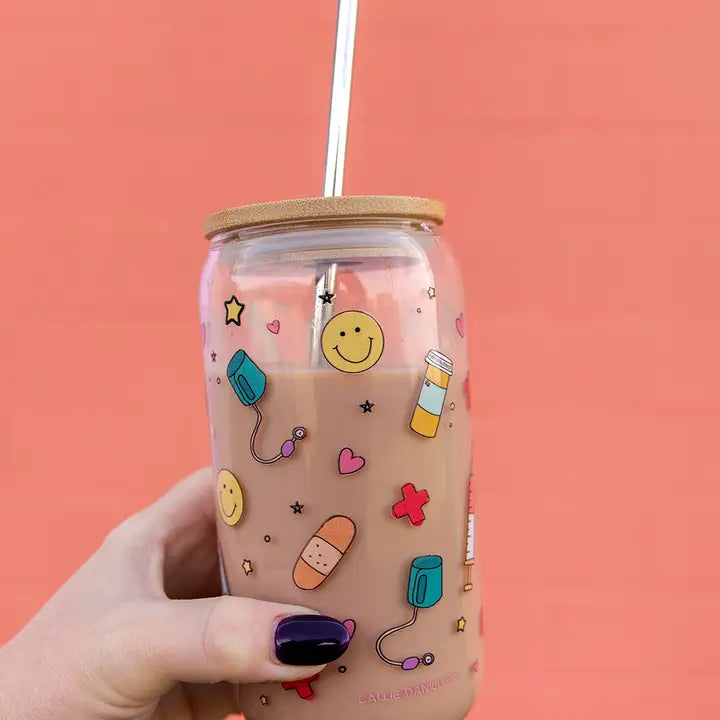 Show your appreciation to the healthcare heroes with our Healthcare Icons Glass Can. This glass can makes the perfect gift for nurses, doctors, and all healthcare workers to show your appreciation for all they do! You'll be sure to enjoy sipping coffee, tea, or water from this cup. Accompanied by a stainless steel straw and bamboo lid this cup makes a practical drinkware choice whether they are gearing up for a big shift or relaxing at home. The Healthcare Icons Glass Can features hand-drawn doodles of medical supplies and is sure to bring smiles!