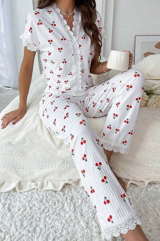 Lace trim Red Cherry Print top Lounge pajama Valentines set