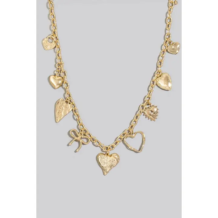 This chain necklace features a fashionable mixed heart and ribbon charms style. Immerse yourself in the details of design, as this chain necklace effortlessly becomes a conversation starter.