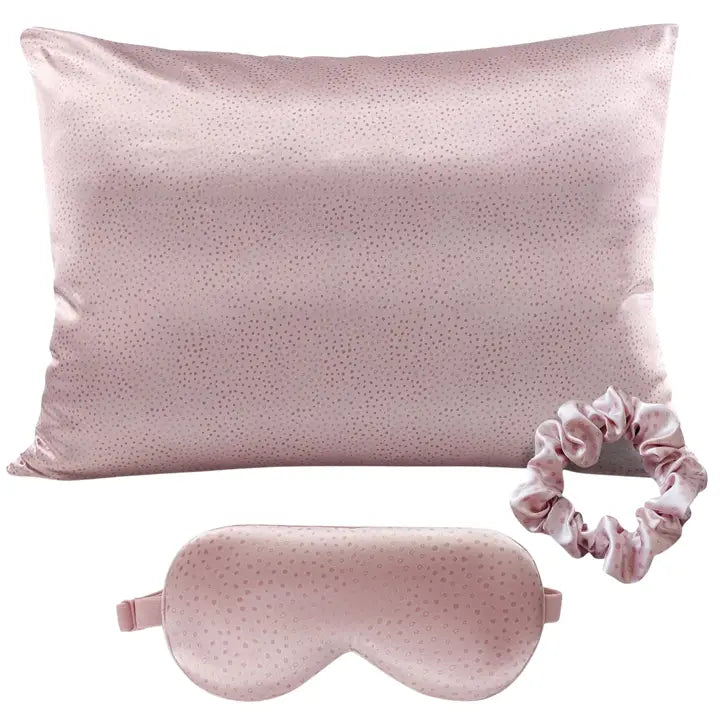Our Satin Sleep Set comprises of an exquisite standard pillowcase with a zipper closure, a sleep mask adorned with an adjustable strap, and a glamorous satin Scrunchie.