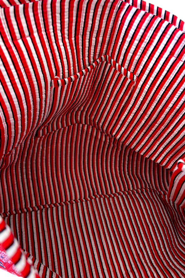 Bold, bright, and made to stand out—this eye-catching quilted tote is your new everyday essential. Featuring a vibrant red base adorned with a playful floral pattern in pink and navy, it brings a pop of color to any outfit. Sturdy striped handles add a touch of charm while ensuring comfortable carrying. Spacious enough for your daily must-haves, a laptop, or a weekend read, this tote is perfect for errands, travel, or just brightening up your routine. Functional meets fun in the best way.